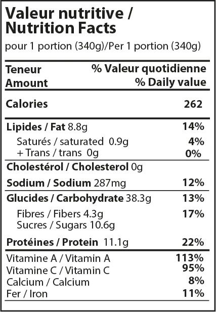 Riz, tofu, bébé maïs, pois, carottes, poivrons, oignons, céleri, champignons, huile de canola, sauce soya, fécule de maïs, ail.